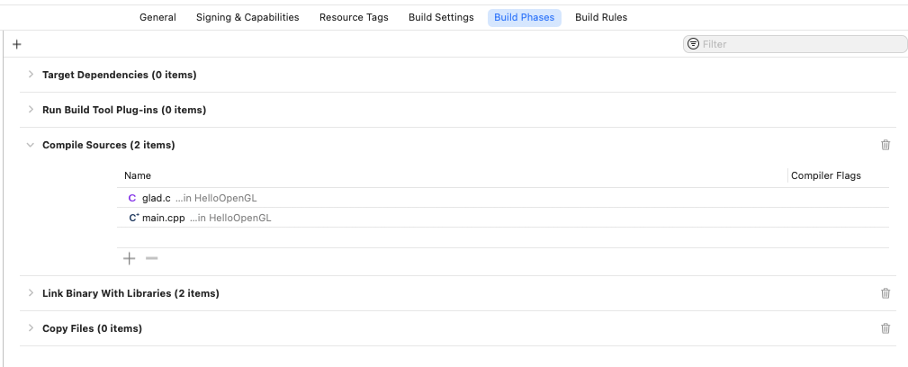 Build Phases ์ Complie Sources์ glad.c ํ์ผ๋ ์ถ๊ฐํด ์ค๋๋ค.